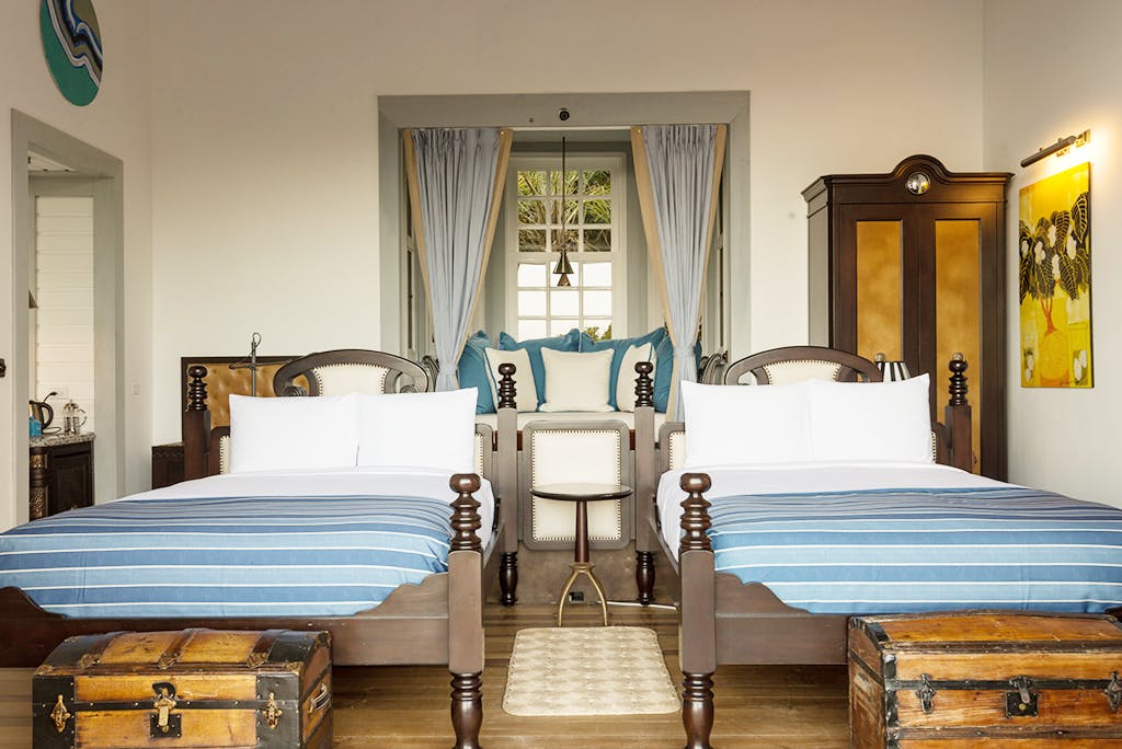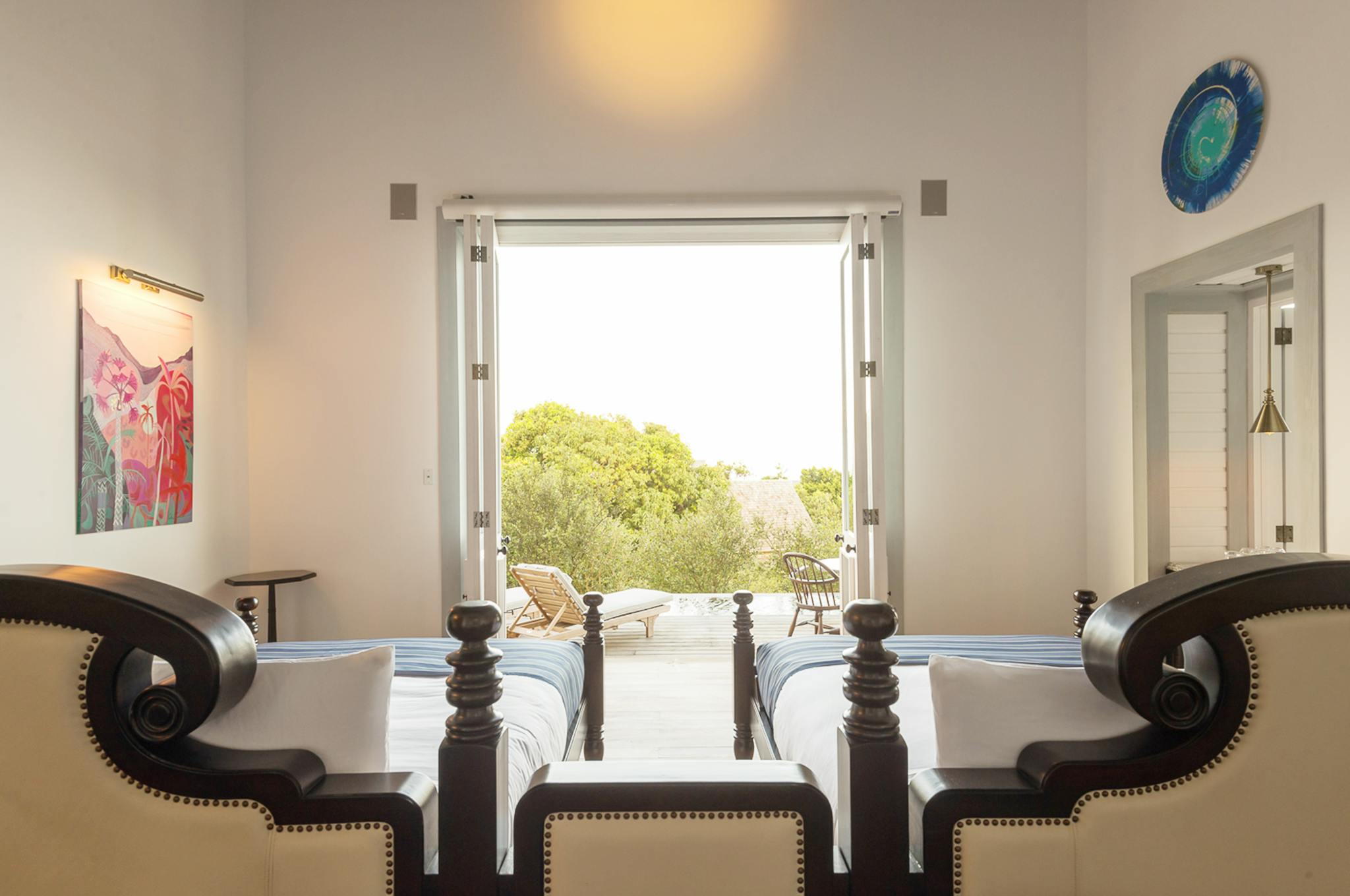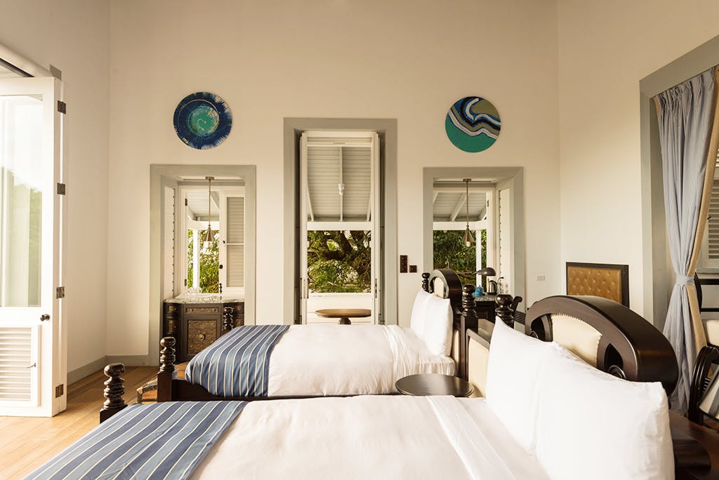The Luxury Cottage with 2 Queens offers open verandas and decks that skirt the Cottage. Unwind on a daybed or cool off in your private pool that overlooks tropical forests or the Caribbean Sea. Inside, you’ll find high ceilings and all the features you expect from a luxury Caribbean resort, but much more. However kindly note that our Cottage accommodation is not wheelchair accessible. You can transform the room into a personal cinema with the assistance of a giant pull-down screen and projector. Specially formulated organic toiletries are carefully selected for your private bathroom veranda, to enhance your rainwater shower or your soak in the freestanding bathtub. A private Luxury Cottage with two queen beds, spacious open-air bathroom and a private pool.
