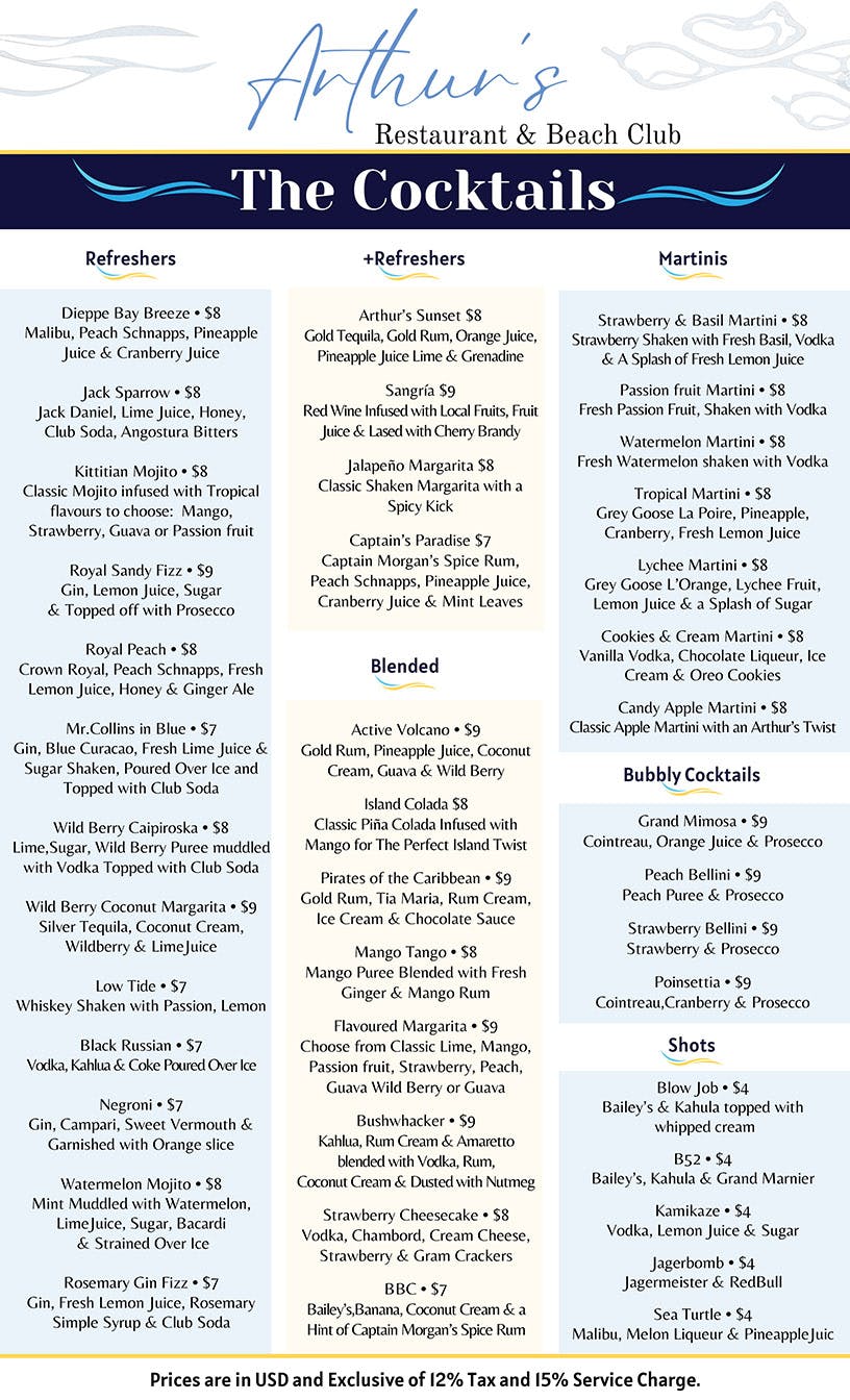 Arthurs Menu | Breakfast Menu | Pool Bar Menu | The Kitchen Menu | Arthurs Cocktail Menu | BMF Cocktail Menu | Dessert Menu